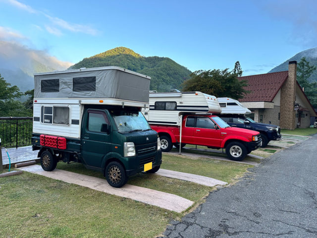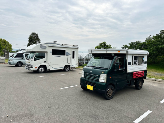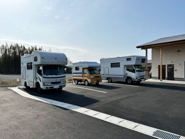 爽やかな空気が満喫できる標高650mの吉無田高原にあるRVパーク。その「パティオ(中庭)」という名の通り、オール芝生の車中泊サイトになっています。新設された「共有スペース」は天井も高く、焚き火やBBQもできます。またステージや大型スクリーンなどもあるので、ちょっとしたプチオフもできるかもしれません。