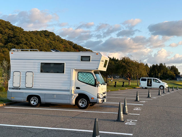 三方を山に囲まれた脇田温泉の高台に位置するRVパークからは、雲が山々の間に渦巻くのが見え、まるで◯ブリのアニメにでも出てくるような雰囲気です。男女合わせて10種の露天風呂は、たとえ脂ギッシュな人でも、完全に脂抜きするには十分過ぎるほどです。