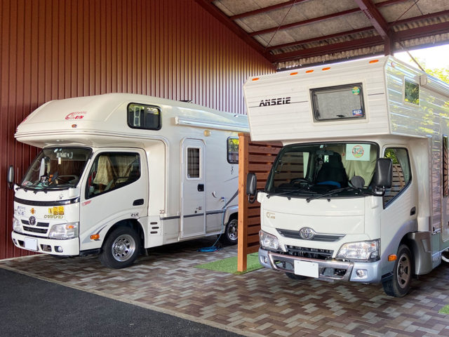 福岡県柳川市にあるキャンピングカー屋さん本社にあるRVパーク。日本初の全天候型RVパークです。まず驚くのは、高さ4mの屋根付きという事。それも単に屋根があるだけではなく、ウッドデッキテラスが付いていて、そこで、BBQまでできてしまうというスペシャル仕様!水場や、トイレ、シャワーまでも完備!